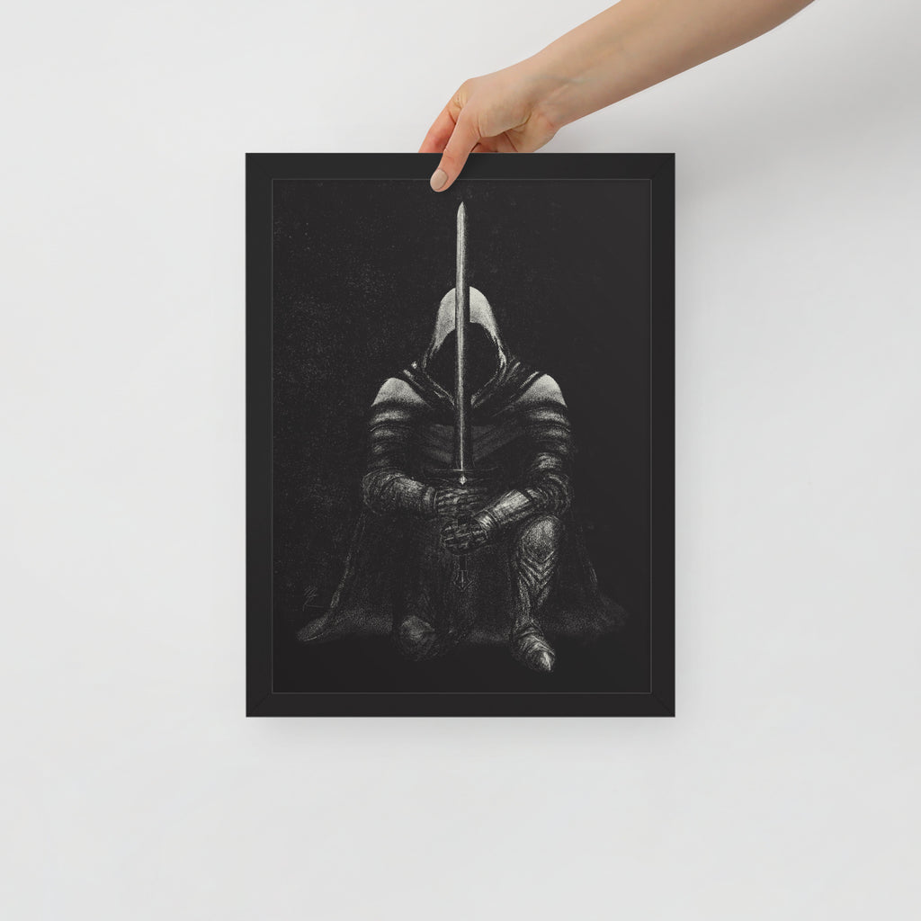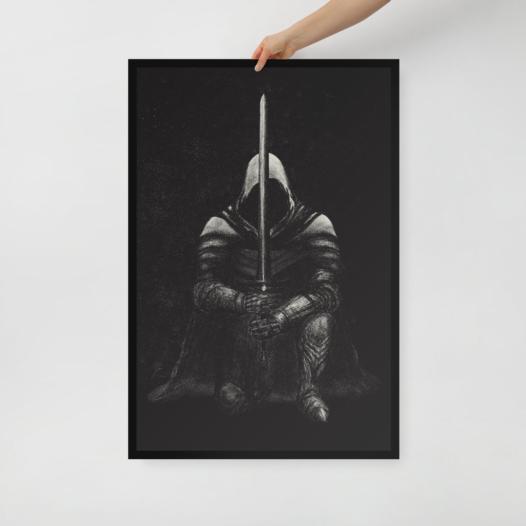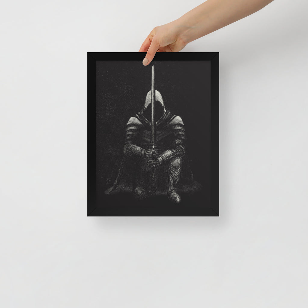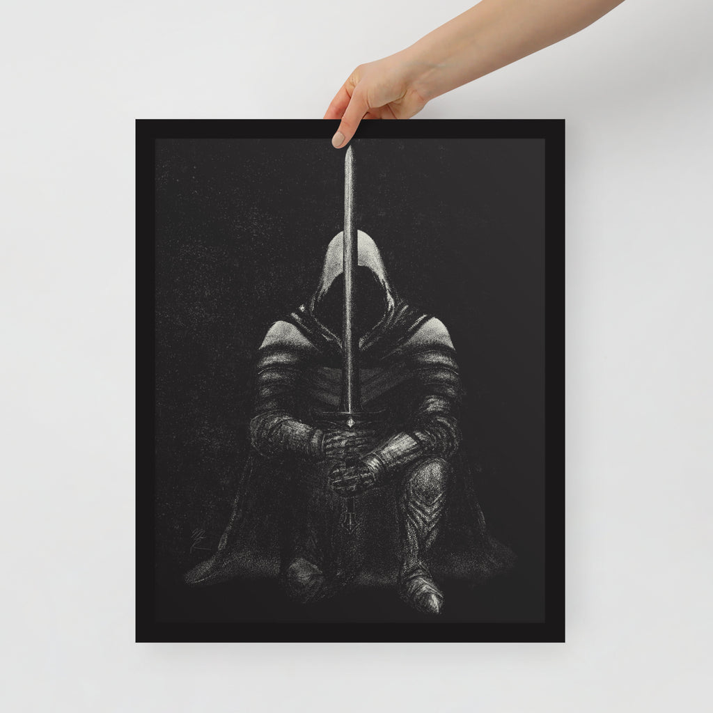 This framed poster art print of "Sworn" by Maggie Robison is printed on high-quality paper, with a partly glossy, partly matte finish. "Sworn" is a hand-drawn stipple piece that has become the core for the first collection of The West Keep.